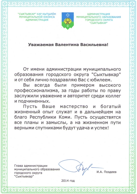 От имени администрации муниципального образования городского округа «Сыктывкар» и от себя лично поздравляю Вас с юбилеем. Вы всегда были примером высокого профессионализма, за годы работы по праву заслужили уважение и авторитет среди коллег и подчиненных. Пусть Ваше мастерство и богатый жизненный опыт служат и в дальнейшем на благо Республики Коми. Пусть осуществятся все планы и замыслы, а на жизненном пути верными спутниками будут удача и успех!