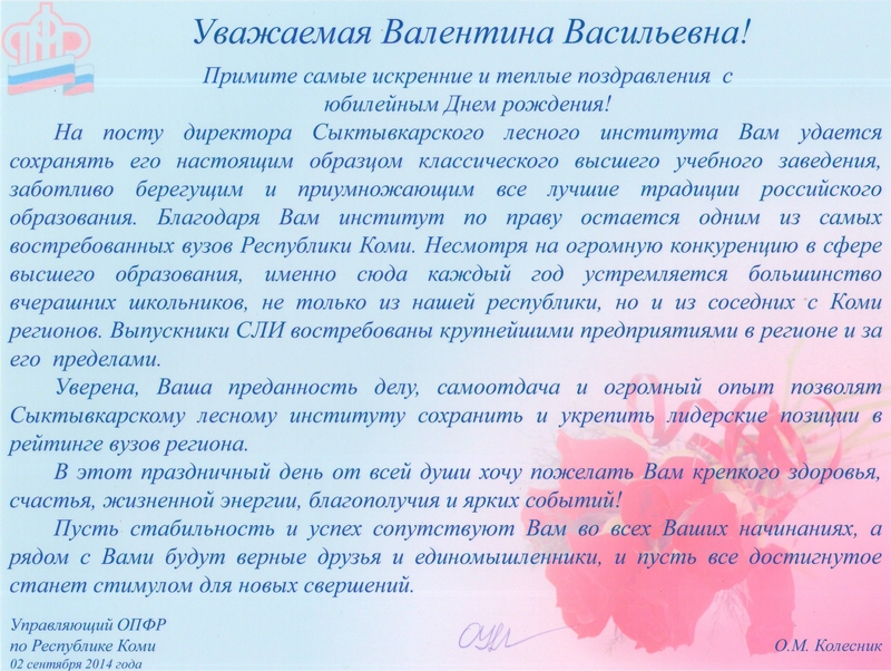 От всей души сердечно поздравляем Вас с Юбилейным Днем рождения! Вся Ваша жизнь была наполнена упорным, целенаправленным трудом в деле становления и развития высшего профессионального образования Республики Коми.