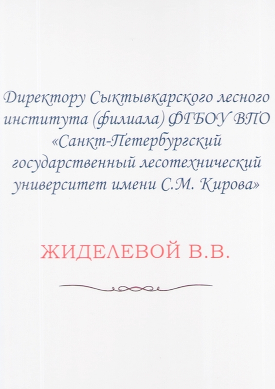 Ваши знания, управленческий опыт и высокие деловые качества в полной мере востребованы на посту директора Сыктывкарского лесного института (филиала) ФГБОУ ВПО «Санкт-Петербургский государственный лесотехнический университет имени С. М. Кирова». Авторитетный и энергичный руководитель Вы обладаете большим профессиональным опытом, мудростью политика и принципиальной гражданской позицией, что позволяет Вам с неизменным успехом решать поставленные перед Вами задачи.