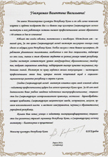Далее в нынешних непростых экономических условиях Вы успешно сдаете экзамен на верность избранной профессии, на высоком уровне справляясь с возложенными задачами. Своим личным примером Вы воспитываете в студентах те качества, которые не теряют ценности ни при каких обстоятельствах —честность, верность Родине, преданность делу. Выражаем Вам свою искреннюю признательность за твердость гражданской позиции в деле воспитания молодежи — будущего нашей страны.