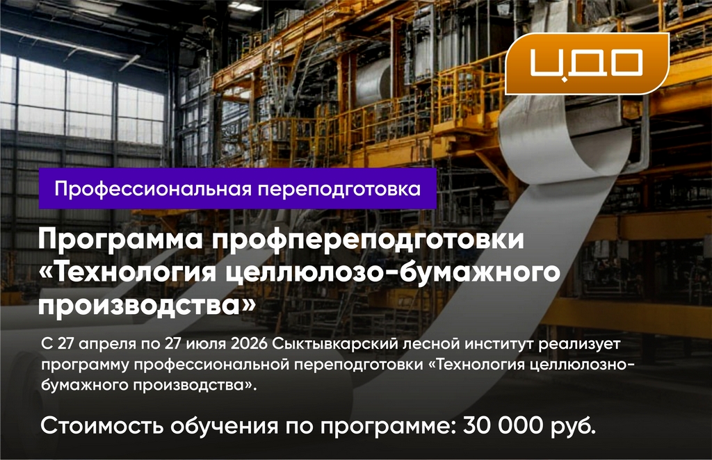С 27 апреля по 27 июля 2026 Сыктывкарский лесной институт реализует программу профессиональной переподготовки «Технология целлюлозно-бумажного производства».