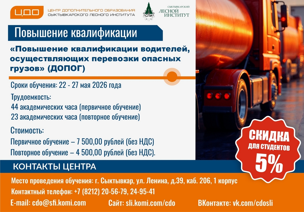 С 22 по 27 мая 2026 года Сыктывкарский лесной институт реализует программу профессионального обучения «Повышение квалификации водителей, осуществляющих перевозки опасных грузов» (ДОПОГ).