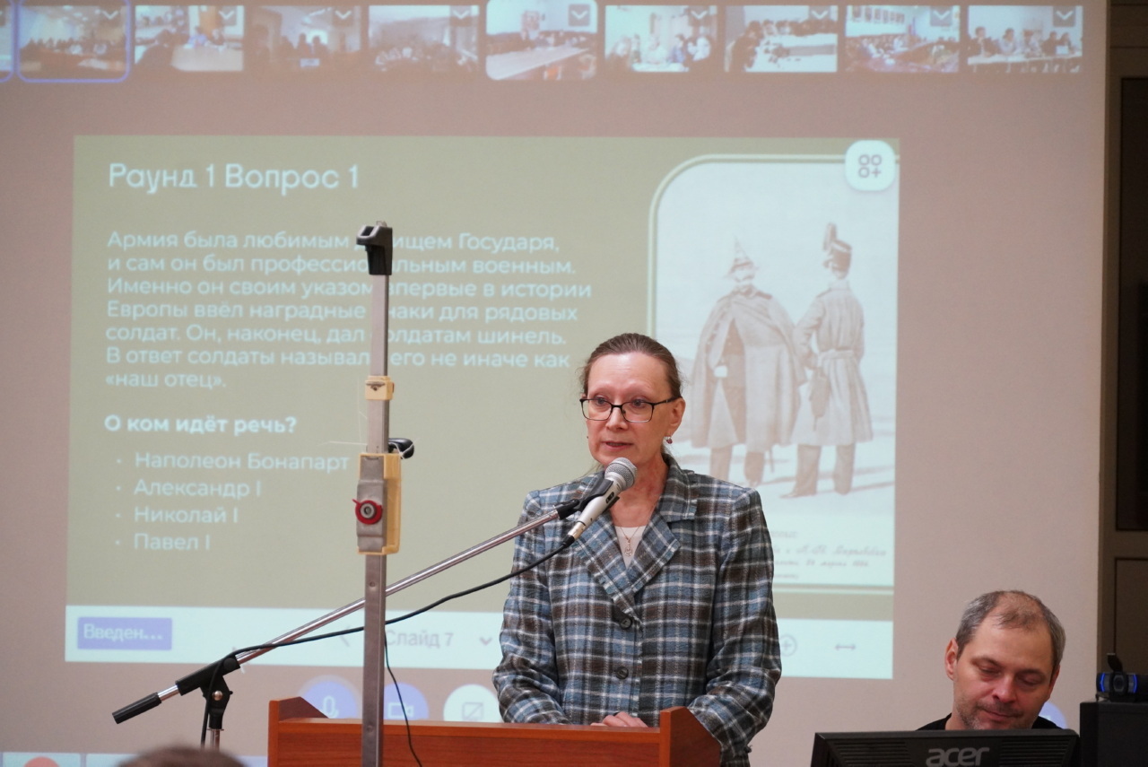 Директор СЛИ Любовь Александровна Гурьева, как радушная хозяйка мероприятия, приветствовала участников. Она подчеркнула растущий интерес к такому формату взаимодействия, ведь количество участников практически удвоилось, обратила внимание на выбор исторической темы для конкурса, а также особенно выделила, что все участники игры откроют для себя новые страницы прошлого нашей великой страны.