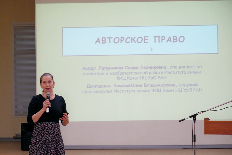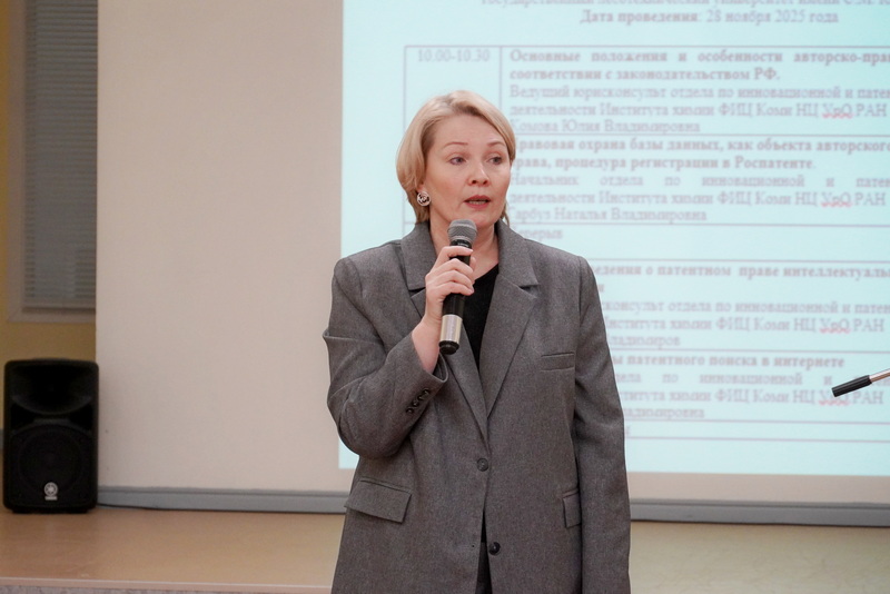 В рамках мероприятия выступили Наталья Владимировна Гарбуз, начальник отдела по инновационной и патентно-юридической деятельности Института химии ФИЦ Коми НЦ УрО РАН, совместно с Юлией Владимировной Комовой, ведущим юристом-консультантом отдела по инновационной и патентно-юридической деятельности ФИЦ Коми НЦ УрО РАН.