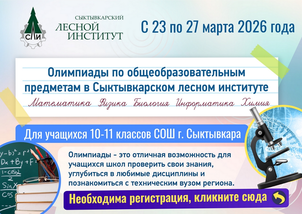 С 23 по 27 марта 2026 года в Сыктывкарском лесном институте пройдут олимпиады по общеобразовательным предметам для учащихся 10 и 11 классов общеобразовательных учреждений г. Сыктывкара.
