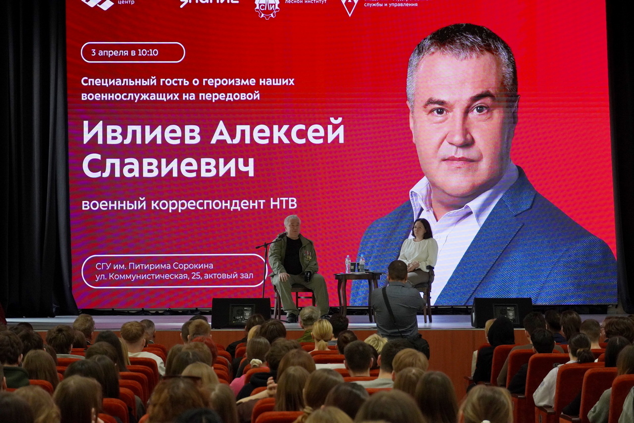 Третьего апреля в СГУ имени Питирима Сорокина прошла встреча с военным корреспондентом НТВ Алексеем Ивлиевым. Гостя слушал полный зал — и это неудивительно. Формат открытого диалога без заготовленных речей собрал не только студентов принимающего вуза, но и ребят из Сыктывкарского лесного института и Коми республиканской академии госслужбы.