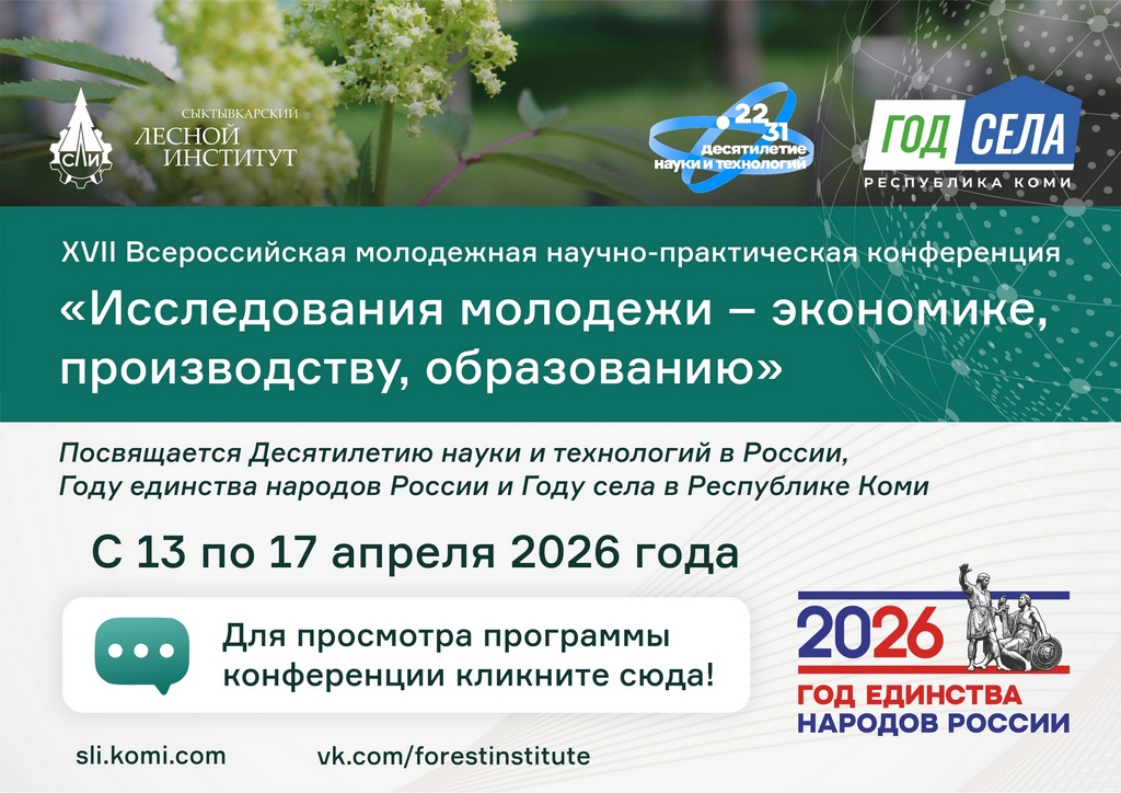 Конференция состоится 13-17 апреля 2026 года на площадке Сыктывкарского лесного института (г. Сыктывкар, Республика Коми). Для участия в конференции приглашаются молодые исследователи: школьники и студенты, учащиеся вузов и сузов, магистранты и аспиранты в возрасте до 35 лет.