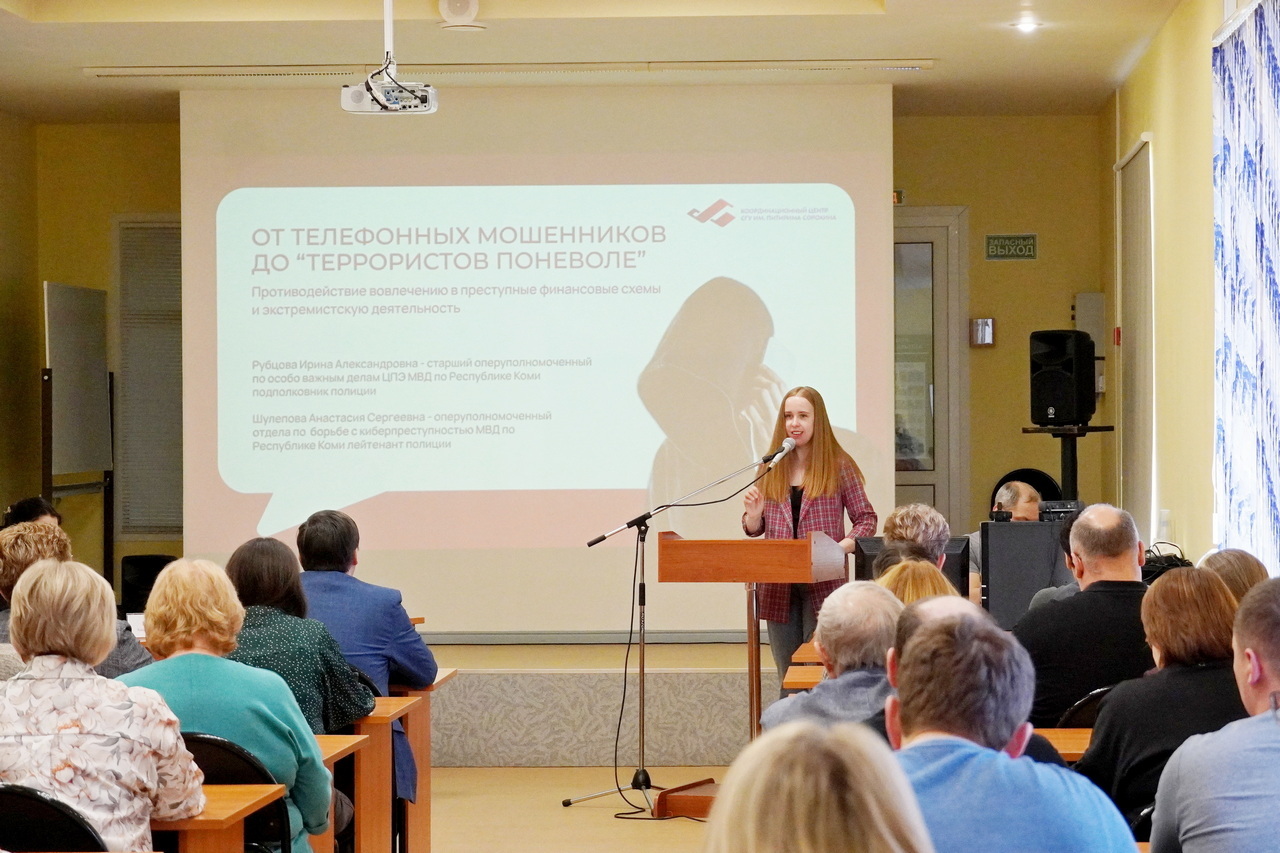 Координационный центр СГУ им. Питирима Сорокина провел лекторий для преподавателей Сыктывкарского лесного института. 21 апреля в стенах Сыктывкарского лесного института состоялась важная встреча, объединившая представителей Координационного центра Коми и профессорско-преподавательский состав Сыктывкарского лесного института. Тема мероприятия, организованного Координационным центром, звучала более чем актуально: «От телефонных мошенников до "террористов поневоле": противодействие вовлечению в преступные финансовые схемы и экстремистскую деятельность».