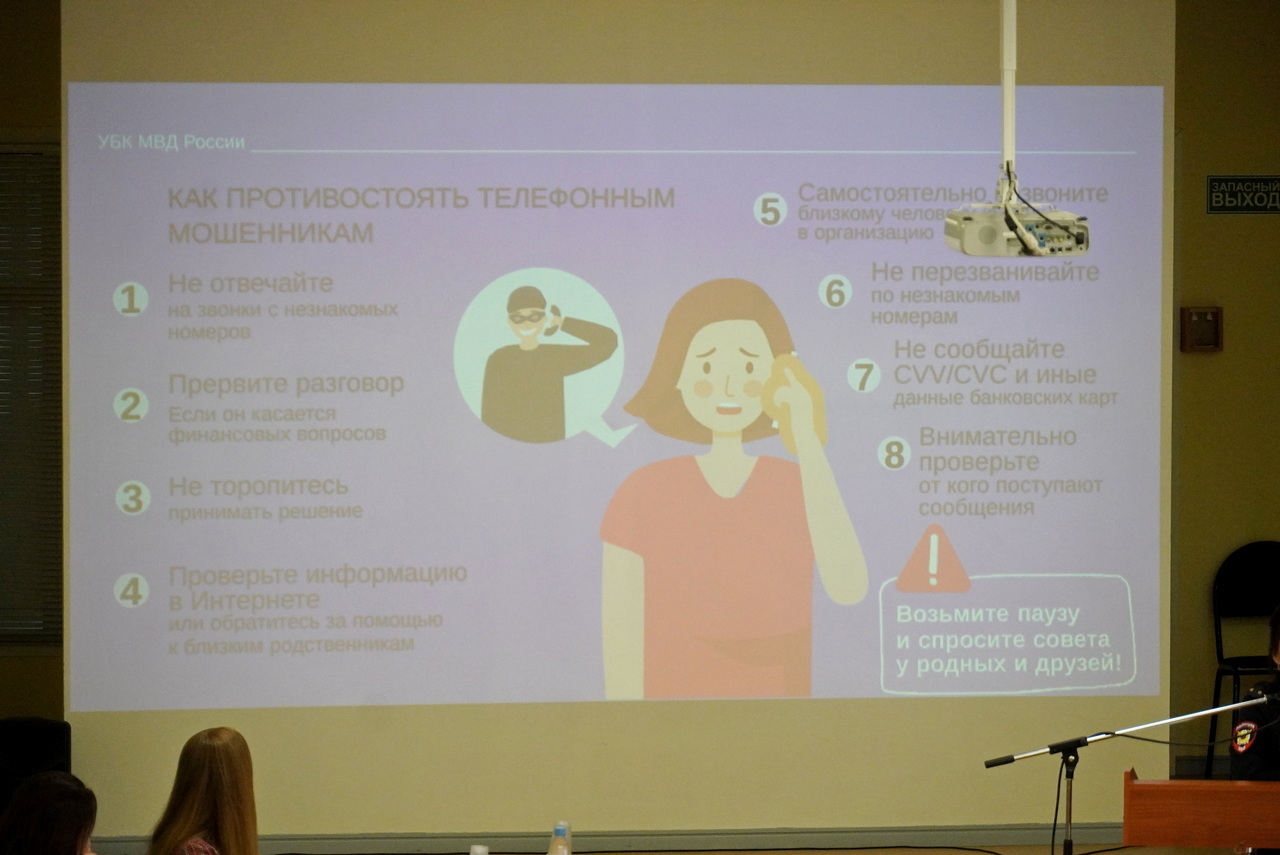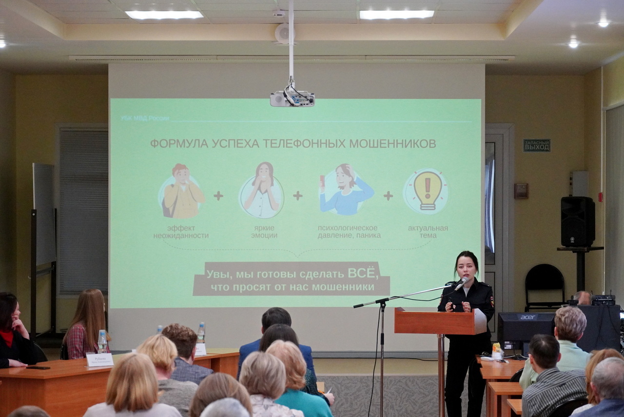 Анастасия подробно разобрала схемы, которые используют телефонные и интернет-мошенники для вовлечения граждан в преступные финансовые схемы. Особое внимание было уделено феномену дропперства — когда людей, часто не подозревающих о тяжести последствий, используют для обналичивания похищенных средств.